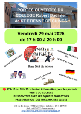 Nous vous informons que la JPO du collège, pour les futurs élèves de 6°, aura lieu le VENDREDI 29 MAI 2026 de 17 h 00 à 20 h 00